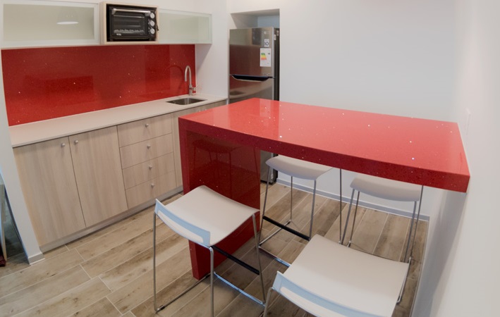 Diseño, fabricación y habilitación de oficinas Fistur. Creamos muebles a medida pensando en el bienestar del equipo de trabajo, destacamos el área de la cocina, cómo punto para compartir y baños con detalles que marcan la diferencia.